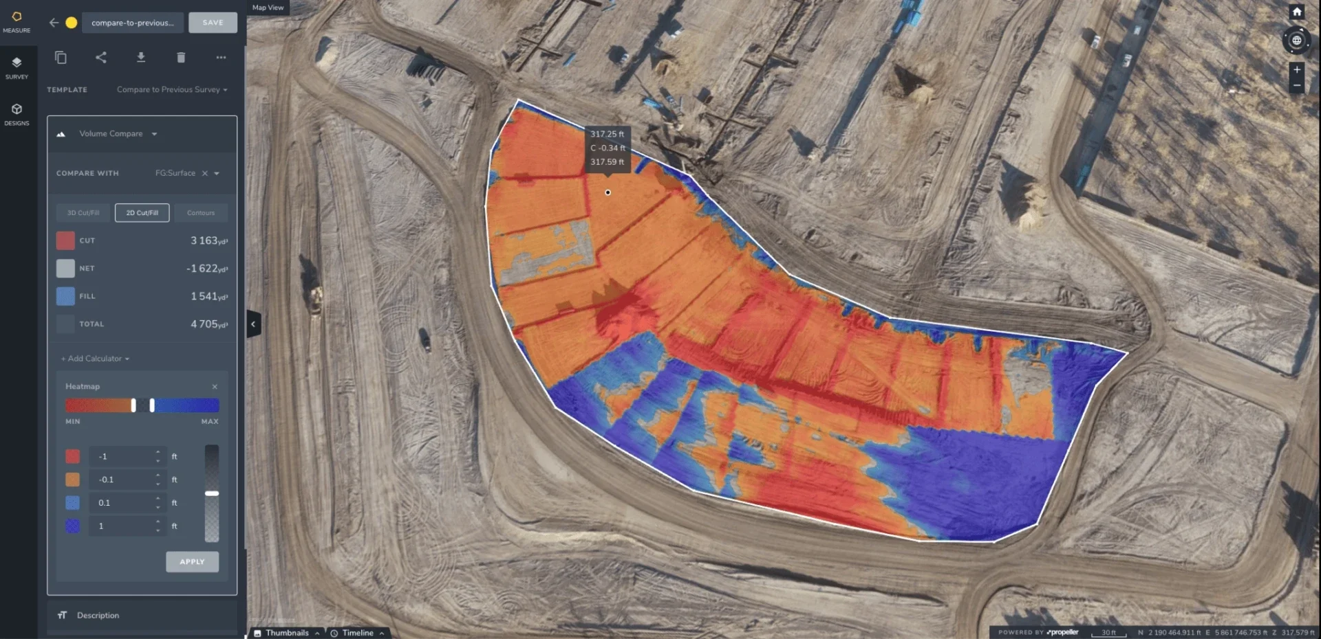 • Earthwork level control - Using RTK and our ground map point solution, we can determine elevational horizon levels for ground moving crews. Progress can be saved and placed into a timeline which allows companies to see the progress while maintaining visual control.